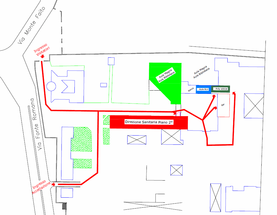 Dall'ingresso visitatori in via Monte Faito: Proseguire fino al CUP, girare a sinistra e raggiungere il ponte di collegamento tra la palazzina della direzione sanitaria e la sala conferenze, sotto al ponte di collegamento a destra entrare nella porta automatica e subito alla sinistra, utilizzando le scale o l'ascensore, salire al primo piano. Dall'ingresso accettazione in via Fonte Romana: Prendere a sinistra e attraversare i giardini, girare a sinistra e proseguire fino a raggiungere il ponte di collegamento tra la palazzina della direzione sanitaria e la sala conferenze, sotto al ponte di collegamento a destra entrare nella porta automatica e subito alla sinistra, utilizzando le scale o l'ascensore, salire al primo piano.